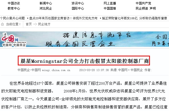 近日各大網站相繼發布:晨星Morningstar公司全力打擊假冒太陽能控制器廠商 1.中國網:2013-03-20發布