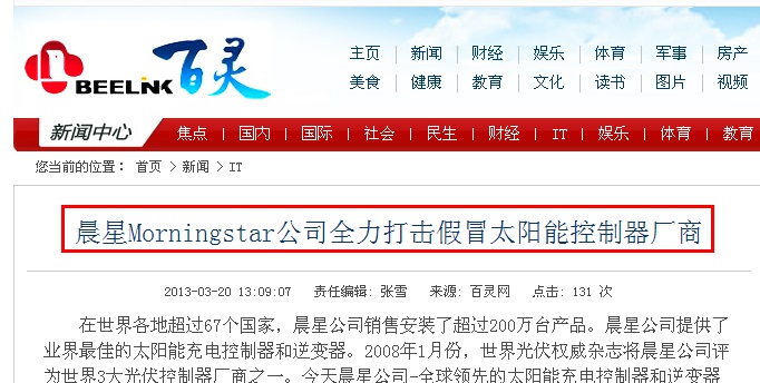 近日各大網站相繼發布:晨星Morningstar公司全力打擊假冒太陽能控制器廠商 1.百靈網:2013-3-20發布